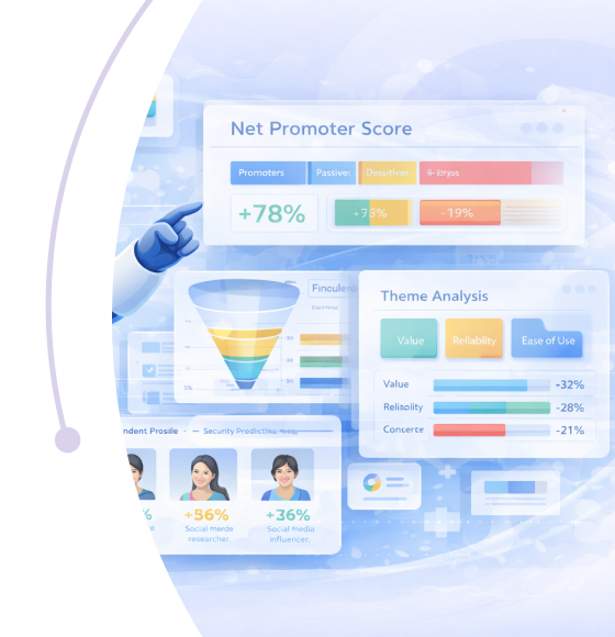 Identify high-value segments and predict behavior from your research data. Model drivers of satisfaction, loyalty, and conversion with AI.