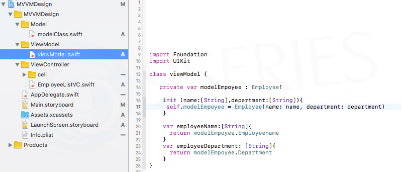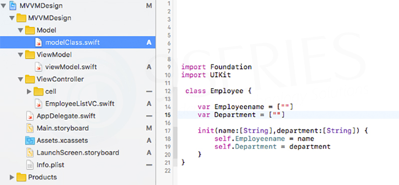 First, create a project in Xcode. Also, create Model and ViewModel Class. In this project, we have taken tableView and shown employee name and its department using MVVM design pattern.