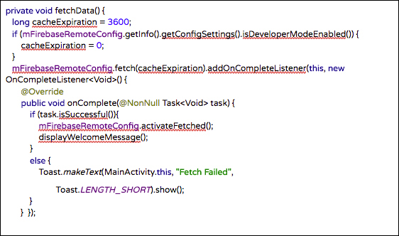 - Creates fetch() request to fetch values from the Remote Config Server and callsactivateFetched() to make those values available to the app. Add below method in your MainActivity.java file.