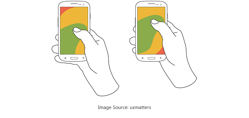 Hand positions and grip should affect the placement of controls on mobile app design. It is important to place high-level objectives and frequently used controls within thumb reach. In the following figure, the diagram that appears on a mobile phone screen is approximately the access chart, in which the colors indicate that the user can reach the areas with a thumb to interact on the screen. Green indicates the area that a user can easily reach; Yellow indicates an area that needs height, And red indicates the area for which users need to hold the device.